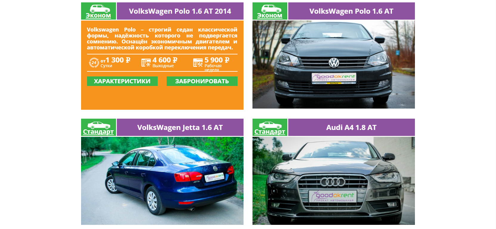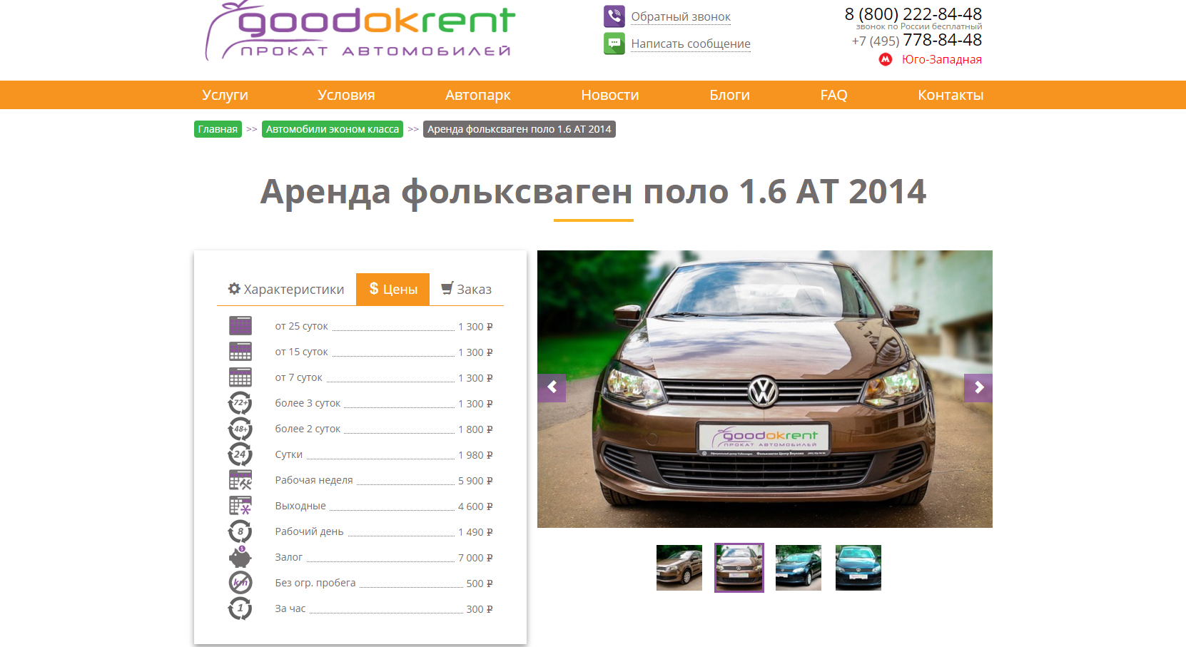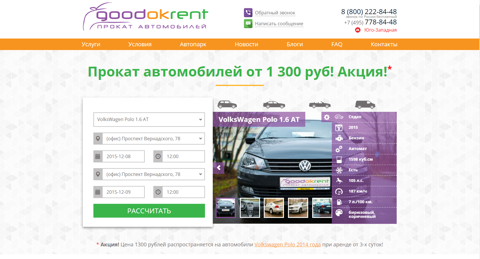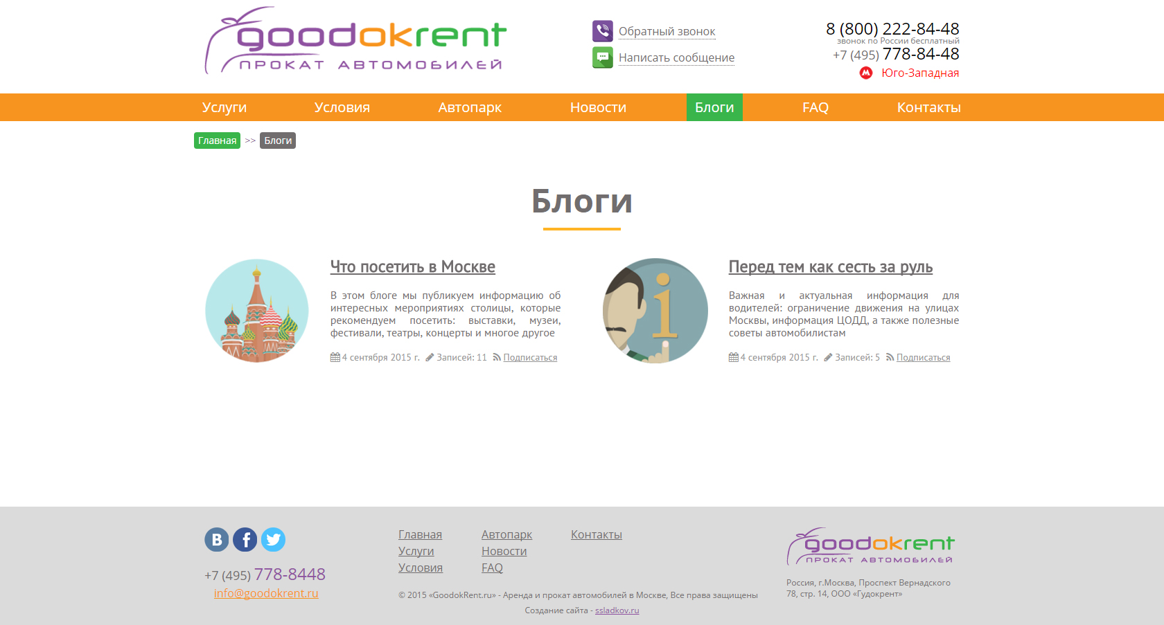 Компания Goodokrent занимается прокатом автомобилей в Москве. Старый дизайн и структура сайта не позволяли использовать его в качестве эффективного инструмента продаж. Мною был разработан дизайн с нуля в соответствии с новыми требования для продаж услуг компании. Помимо основных разделов, на сайте присутствуют новостная лента и блоги в которых регулярно публикуется полезная информация по автомобильной тематике и интересным событиям в городе. Также я занимаюсь продвижением этого сайта: за 3 месяца сайт по ряду ключевых запросов поднялся в ТОП10 поисковой выдачи Яндекса. Среднесуточная посещаемость ресурса: ~150 человек