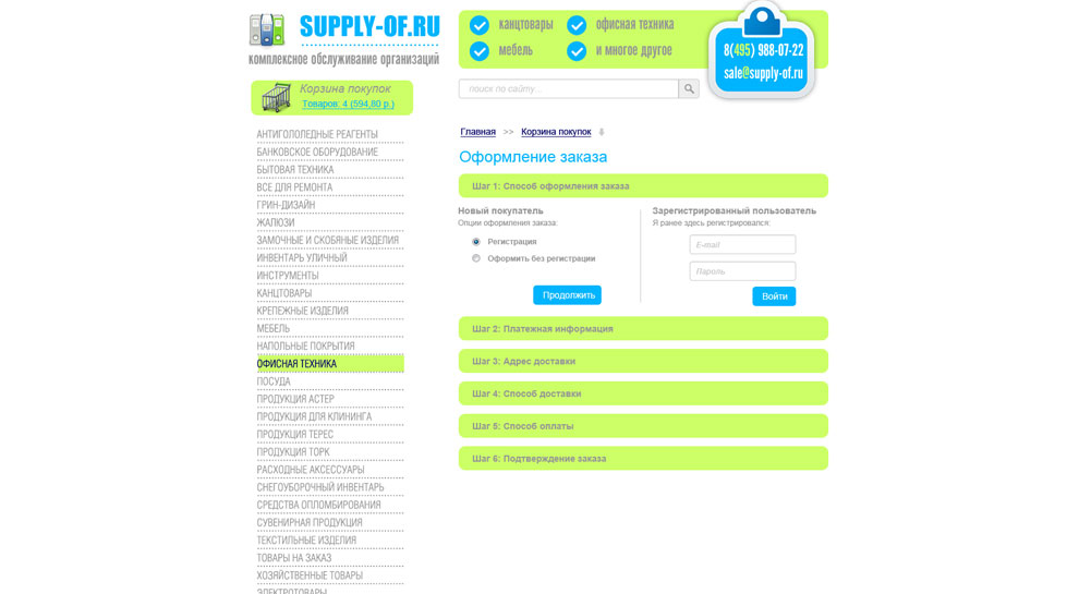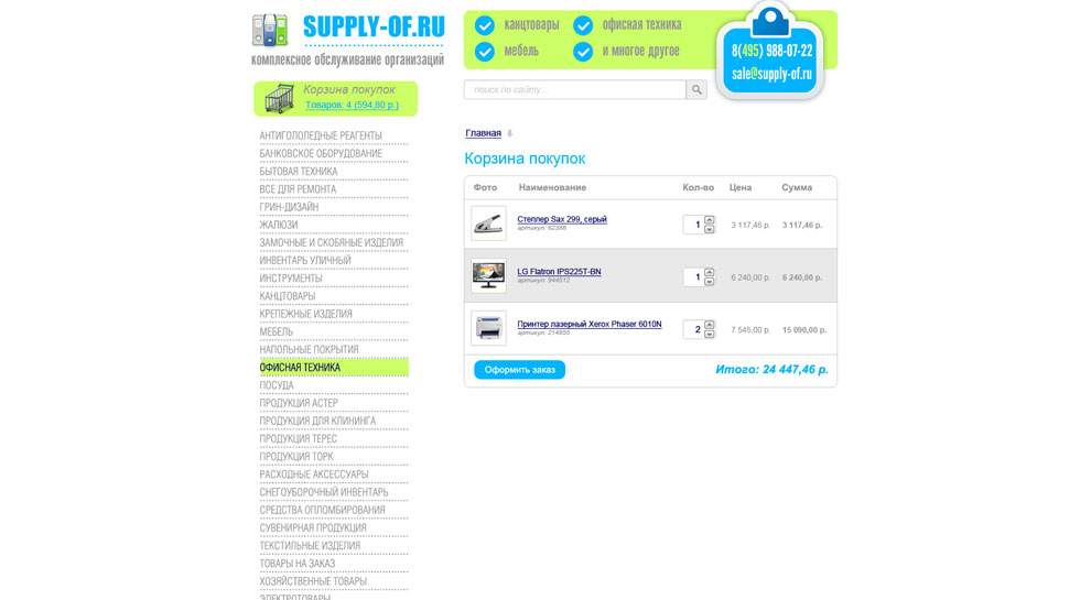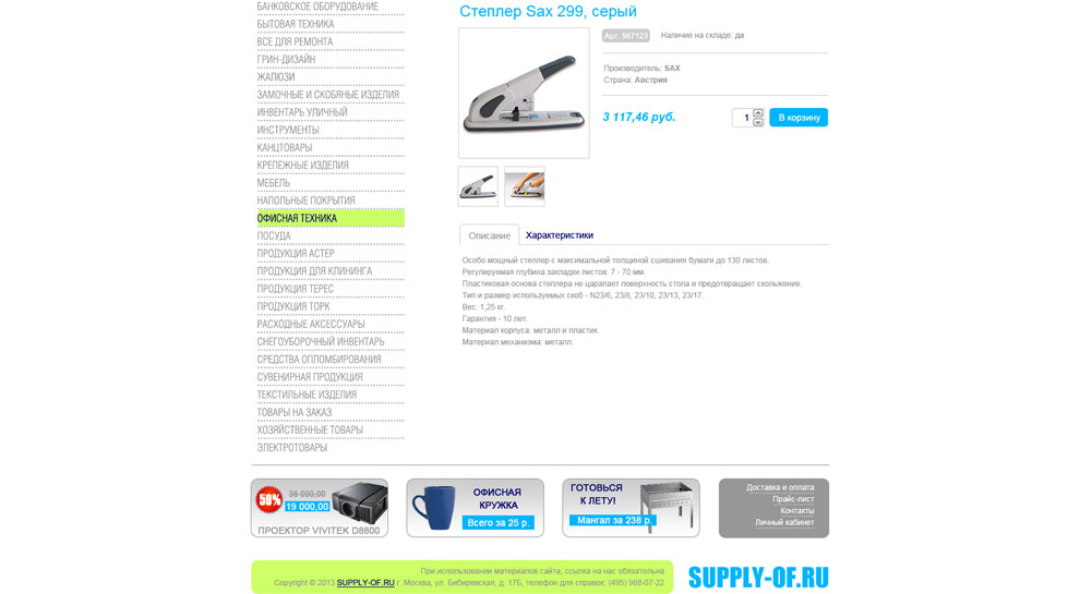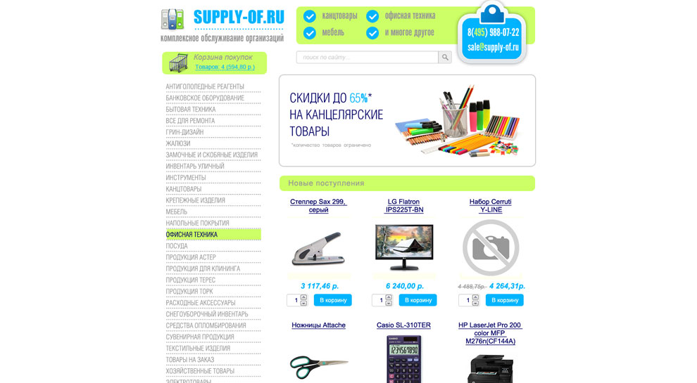 Интернет-магазин товаров для офиса. Система предоставляет полный цикл для организации интернет-торговли: размещение и редактирование товара и товарных групп, актуализация количества, автоматическая регистрация клиентов, управление корзиной, оплата товара через платежные шлюзы, выбор способа доставки, оповещение по e-mail