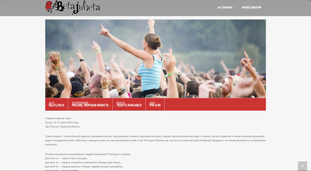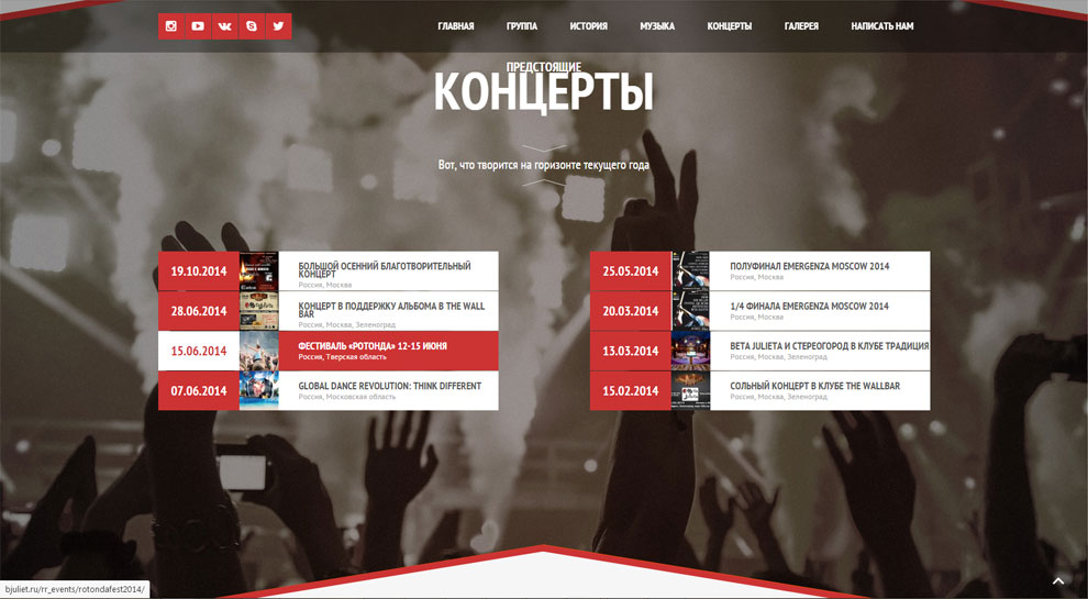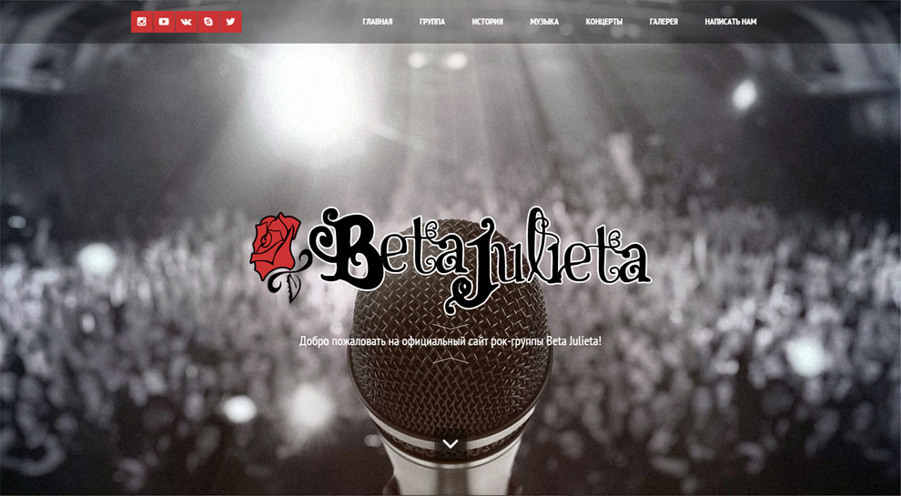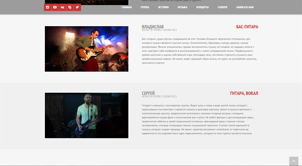 Официальный сайт моей рок-группы. Структура - одностраничная с внутренними страницами мероприятий и страницей архива мероприятий. Выгрузка аудио-контента просиходит с SoundCloud, фотографии вытаскиваются с Instagram. В данный момент сайт решает чисто информационную задачу, со временем подключу блог, когда информации будет больше и возможно стену для живого общения